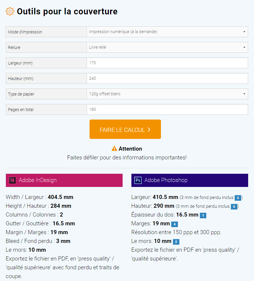 Pour vous faciliter la tâche, nous mettons à votre disposition un outil de calcul sur notre site web. Vous pouvez reprendre les données calculées par notre outil pour configurer en toute simplicité votre fichier InDesign :